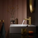 Denne betagende, messing-farvede overflade kalder Hansgrohe for "poleret guld-optik". Den smukke finish giver et strejf af varme til rummet, mens det gyldne blikfang komplimenterer både det lyse og mørke badeværelse.