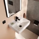 Vaskens bassin har en god og anvendelig stĂžrrelse, ligesom den brede kant mod vĂŠggen giver plads til sĂŠbedispenser, tandkrus eller et lille duftlys.