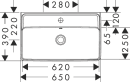 Vaskens bassin har en god og anvendelig stĂžrrelse, ligesom den brede kant mod vĂŠggen giver plads til sĂŠbedispenser, tandkrus eller et lille duftlys.