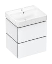 Den dybe Xanuia Q vask i hvidt sanitetsporcelæn giver dig god plads til både håndvask og daglige rutiner. Under vasken finder du to rummelige skuffer med soft close, hvor du nemt kan opbevare dine hverdagsprodukter. Ønsker du at strukturere indholdet i skufferne, kan du tilføje skuffeinddeling fra Hansgrohes Intrastoris serie.