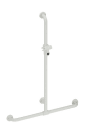 Med denne løsning fra Hewi, som minder om et omvendt T, får du en elegant og funktionel løsning til dit brusebad. Ved montering kan du justere, hvor på den vandrette stang den lodrette stang skal placeres. Den lodrette stang har desuden en ergonomisk udformet, justerbar holder til din håndbruser.