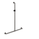 Med denne løsning fra Hewi, som minder om et omvendt T, får du en elegant og funktionel løsning til dit brusebad. Ved montering kan du justere, hvor på den vandrette stang den lodrette stang skal placeres. Den lodrette stang har desuden en ergonomisk udformet, justerbar holder til din håndbruser.