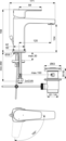 Denne model har 105 mm til det punkt, hvor vandet kommer ud, hvilket giver god plads og komfort ved håndvasken. Den leveres med en bundventil, der styres med et håndtag.