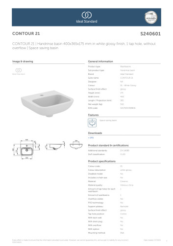 Skab et stilfuldt og funktionelt badevÊrelse med Contour 21 hÄndvasken fra Ideal Standard. Denne pladsbesparende vÊghÊngte hÄndvask er perfekt til mindre badevÊrelser eller gÊstetoiletter, hvor hver kvadratcentimeter tÊller.