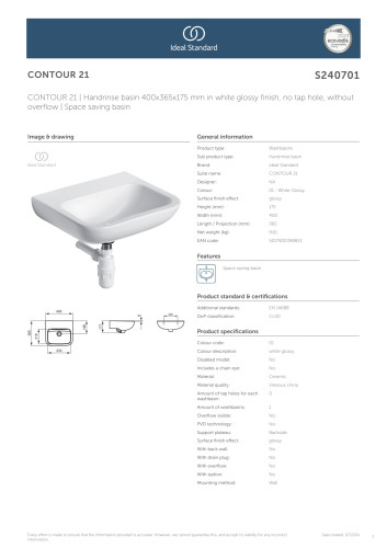 Skab et stilfuldt og funktionelt badevÊrelse med Contour 21 hÄndvasken fra Ideal Standard. Denne pladsbesparende vÊghÊngte hÄndvask er perfekt til mindre badevÊrelser eller gÊstetoiletter, hvor hver kvadratcentimeter tÊller.