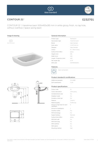 VÊlg Ideal Standard Contour 21+ hÄndvasken for et stilrent og praktisk element til dit badevÊrelse, hvor bÄde design og funktion gÄr hÄnd i hÄnd.