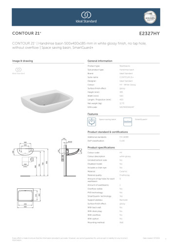Vælg Ideal Standard Contour 21+ håndvasken for et stilrent og praktisk element til dit badeværelse, hvor både design, hygiejne og rengøringsvenlighed går hånd i hånd.