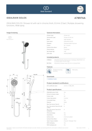 Ideal Rain Solos sikrer en optimal dækning med sin brede brusestråle og et lavt vandforbrug. Med SmartShine-belægningen holdes kalk og pletter væk, så brusesættet bevarer sit flotte udseende i mange år.