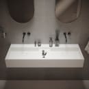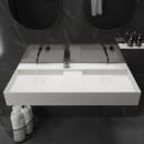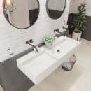 HÄndvaskens design uden hanehul giver dig frihed til at vÊlge to vÊghÊngte armaturer eller bore to hanehuller med et kopbor, hvis det foretrÊkkes. For et sÞmlÞst look, er hÄndvasken ekskluderet overlÞb.