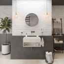HÄndvaskens design uden hanehul giver dig frihed til at vÊlge et vÊghÊngt armatur eller bore et hanehul med et kopbor, hvis det foretrÊkkes. For et sÞmlÞst look, er hÄndvasken ekskluderet overlÞb.