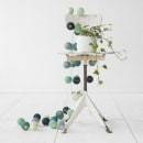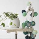 Lyskæde med flotte kugler i grønne og blå nuancer - Meget friske farver der står godt til hinanden og giver lidt landlig stemning.