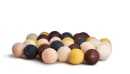 Det er farverne fra Nyhavn der er samlet i denne lyskæde, med kombinationen af petrol,aubergine,sennep, sart lyserød og lysegrå. Boldene sidder 2 og 2 med 14 cm imellem. 20 bolde fordelt på 140 cm kæde-20 LED dioder 35 bolde fordelt på 240 cm kæde- 35 LED dioder