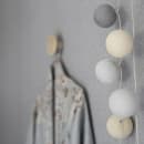 En af vores personlige favorit-kombinationer i lyskæder med farvede kugler - her med fine grå nuancer blandet med en creme kugle