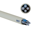 Anvendelse: Kabler designet til permanent installation i jord, vand og rør. De er halogenfri og flammehæmmende. Forsigtighed skal tages i betragtning ved pløjning. Produktet må kun installeres af en autoriseret elinstallatør. Produktet er udviklet i henhold til gældende standarder. Gældende regler for installation skal til enhver tid anvendes. Konstruktion: 1. Aluminiumsleder 2. 4x(16-300mm²): PEX-isolation blå, brun, sort, grå 3. 5x(16-25mm²): PEX-isolation gulgrøn, blå, brun, sort, grå 4. Seperationslag af tape 5. Rivetråd 6. HFFR-kappe Egenskaber: Mærkespænding Uo/U: 0,6/1 kV Prøvespænding: 15 (DC) kV Maks. Kortslutningstemperatur: 250 °C Maks. ledertemperatur under drift: 90 °C Drifttemperatur: fra -20 op til 70 °C Min. Håndteringstemperatur: -20 °C Min. Lagertemperatur: -30 °C Kappefarve: Lysegrå CPR-klassifikation: Dca-s2,d2,a2 UV-bestandigt: Ja (isolering & kappe) Maks. tilladelige trækstyrke: 30 N/mm2 Min. bøjningsradius under installation: 8 x D mm Forpakning: Tromle RoHS: Ja REACH: Ja CE-overensstemmelse: Ja
