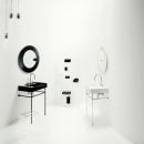 Det unikke skjulte afløb bidrager til det enkle look. Vasken kan monteres på væggen eller kombineres med et underskab fra Kartell Laufen-serien.