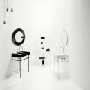Det unikke skjulte afløb bidrager til det enkle look. Vasken kan monteres på væggen eller kombineres med et underskab fra Kartell Laufen-serien.