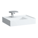 Håndvaskens tynde kanter skaber lethed og den enkle form gør den minimalistisk. De tynde kanter lader sig gøre med Laufens ultrastærke SaphirKeramik, som er en særligt formbar og stærk keramik. Du vil derudover også få meget afsætningsplads til højre, hvor du kan sætte badeværelsesartikler eller andet.