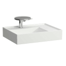Håndvaskens tynde kanter skaber lethed og den enkle form gør den minimalistisk. De tynde kanter lader sig gøre med Laufens ultrastærke SaphirKeramik, som er en særligt formbar og stærk keramik. Du vil derudover også få meget afsætningsplads til højre, hvor du kan sætte badeværelsesartikler eller andet.