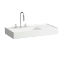 Håndvaskens tynde kanter skaber lethed og den enkle form gør den minimalistisk. De tynde kanter lader sig gøre med Laufens ultrastærke SaphirKeramik, som er en særligt formbar og stærk keramik. Denne håndvask er perfekt til ethvert hjem fordi den har meget afsætningsplads til højre til pynt, badeværelsesartikler. Pladsen på højre side er lavet af keramik og det giver derfor et fuldent udtryk på badeværelset