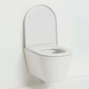 Det væghængte toilet i stilrent design kombinerer bløde linjer med lige kanter. Hele toilettets yderside er glat, så det er nemt at tørre over ved rengøring.