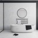 Den matsorte finish skaber en smuk kontrast på det lyse badeværelse, men lægger sig flot i baggrunden på badeværelser med mørke vægge. Er du til det tradtionelle look fås Space også i den glansfulde krom overflade samt en stilren hvid finish.