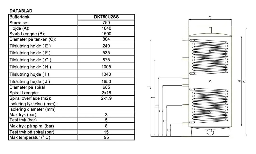 Med Langå 750 liters buffertank, udstyret med 2 integrerede spiraler, får du en alsidig og effektiv løsning til opbevaring og distribution af varme fra flere energikilder. Denne akkumuleringstank er særligt velegnet til varmepumper med lav fremløbstemperatur, solvarmeanlæg, brændefyringsanlæg og varmtvandsbeholdere, hvilket gør den til en perfekt løsning for både nyinstallationer og opgraderinger af dit eksisterende varmesystem.