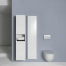 Den rektangulære betjeningsplade fra Laufen fremstår klassisk og harmonisk med sine lige linjer, der fint brydes og komplimenteres af de tværgående trykknapper, som skaber et nyt og lækkert udtryk.