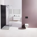 Den rektangulære betjeningsplade fra Laufen fremstår klassisk og harmonisk med sine lige linjer, der fint brydes og komplimenteres af de vertikale trykknapper, som skaber et nyt og lækkert udtryk.
