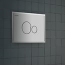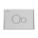 Den rektangulære betjeningsplade fra Laufen fremstår klassisk og harmonisk med sine lige linjer, der fint brydes og komplimenteres af de cirkulære trykknapper, som skaber et nyt og lækkert udtryk, der fuldendes af den stilfulde og stringente ramme omkring selve betjeningspladen.