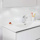 Den medfølgende slanke håndvask i porcelæn komplementerer underskabets stringente udtryk og skaber et harmonisk og fuldendt møbel. Vaskens design, med bassinet der skråner mod bundventilen, er en subtil detalje, der understreger det gennemtænkte design. Den brede afsætningsplads på vasken er perfekt til at placere dine badeværelsesprodukter, hvilket bidrager til en eksklusiv atmosfære.