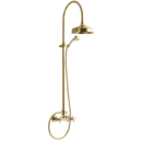 Det smukke brusesystem fra Lavabo er fremstillet i massiv messing, som ved brug vil patinere smukt og få et helt unikt udseende. På brusearmaturets to greb er der en fin hvid porcelænsdetalje, hvorpå der står henholdsvis "Hot" og "Cold". Håndbruseren har et greb af hvidt kunststof.