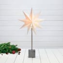 Stjernen står solidt på en fod af beton, mens den lette papirstjerne spreder et blødt lys ud i rummet. Den sorte ledning med afbryder gør det nemt at placere bordstjernen på reolen, i vindueskarmen eller på spisebordet – præcis hvor du ønsker at skabe lidt ekstra hygge. Bemærk, at pæren ikke medfølger, så du selv kan vælge præcis det lys, der passer til din stil.