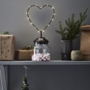Sweetie dekoration med hjerte er skabt til dig, der ønsker at bringe en stemningsfuld og personlig detalje ind i din juleindretning. Den gennemsigtige glaskrukke med sort låg bærer et smukt metalhjerte, omviklet med en kæde af 15 små LED-lys, som spreder et blødt og varmt skær i rummet.
