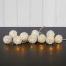 Marcus lyskæde pryder dit hjem med smukke sølvkugler i metal, der minder om små søde snebolde. Lyskæden er 9 meter lang og har 10 lyskugler, der udsender et varmt, hvidt lys. Den er udstyret med en praktisk batteriboks og bruger 3xAA batterier. Lyskæden har indbygget timerfunktion, så du nemt kan styre lysene til automatisk at tænde og slukke uden besvær.