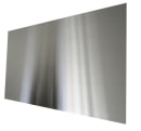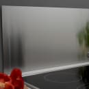 Firkantet stænkplade fremstillet i børstet rustfrit stål til anvendelse ved komfur eller vask. Monteringen foregår med beslag eller ved limning med lodrette baner af klar silikone bagpå pladen, så ventilationen er sikret.