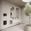 Paper Bin fra Nichba kan kombineres med øvrigt badeværelsestilbehør, såsom papirdispenser, toiletrulleholder, håndklædekroge eller spejl, for at skabe en sammenhængende og stilren indretning.