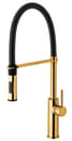 Med dette køkkenarmatur i børstet honningguld og sort får du et stilrent og funktionelt valg, der forener italiensk design med brugervenlighed. Den udtrækkelige tud med fleksibel fjederslange gør det nemt at skylle, fylde og rengøre, uanset om du arbejder med store gryder eller har brug for ekstra rækkevidde i køkkenvasken.