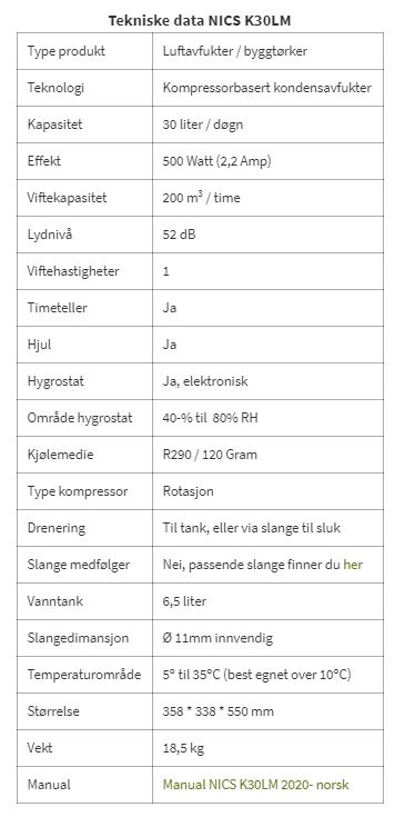 Tørringskapaciteten på NICS K30LM er 30 liter pr. døgn (mål på 30 grader / 80% relativ luftfugtighed) og affugteren kan bruges helt ned til 5 grader, men det er bedst egnet ved temperaturer 10 - 15 grader.