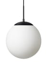 Lampens sorte top og stofledning står i en super skarp og flot kontrast til den hvide glasskærm i smukt opalglas, som giver en god lysspredning i rummet.