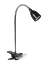 Klemspot med kromarm og sort lampehoved. Lampen har indbygget LED lyskilde og leveres med afbryder på ledningen.