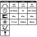 Spot High: 115 lumen, Spot Low: 60 lumen, Flood High: 120 lumen, Flood Low: 60 lumen, Dual: 160 lumen