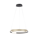 Q-Beluga 2 tonet rund led pendel i nyt elegant design.Q-Beluga blander sort - hvidt og mat messing i en "brudt" ring og giver lampen et nytænkende udtryk. Lampen har en diameter på 600 mm og forbruger op til 55 watt ved 3050 lumen og kan reguleres med den medfølgende fjernbetjening i lysstyrke og i farve tempertur fra 2700 kelvin varm hvid til 5000 kelvin kold hvid. Q-Beluga tilhører vores Smart home lampe serie og kan derfor tilsuttes f.eks google home via zigbee via alle kendte systemer. Lampen kan reguleres i højden fra 600 til 1200mm. Garnati 5 år. Farve. sort/mat messing.