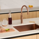 Fusion Square armaturet fra Quooker fås i flere forskellige farver, der alle, på hver sin måde, komplementerer det smukke designsprog og giver karakter og stemning til både klassiske og moderne køkkener. Rose Copper overfladen tager inspiration fra kobber og tilføjer et hint af lyserød, hvilket tilfører køkkenet en varm, tidløs glød, der komplementerer en lys skandinavisk farveskala.