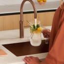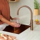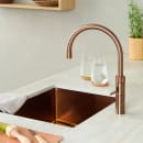 Fusion Round køkkenarmaturet fra Quooker fås i flere forskellige farver, der alle, på hver sin måde, komplementerer det smukke designsprog og giver karakter og stemning til både klassiske og moderne køkkener. Rose Copper overfladen tager inspiration fra kobber og tilføjer et hint af lyserød, hvilket tilfører køkkenet en varm, tidløs glød, der komplementerer en lys skandinavisk farveskala.