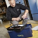 Praktisk værktøjskasse i robust plast. Med udtagelig bakke som indeholder 7 indsatse til småting samt skillevægge til inddeling af bunden. Låget kan åbnes helt hvilket giver fuldt overblik. Solidt greb så værktøjskassen er nem at have med på farten. Ydermerer er denne model med ekstra greb i enderne.