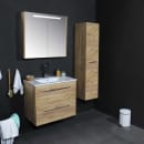 Sanibell Basicline komplet møbelpakke med vask og underskab i whisky eg med forkromede greb. Den flotte whisky eg overflade giver badeværelset varme og dybde.