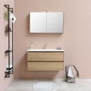 Sanibell Online spejlskab med plads til det du lige har brug for foran spejlet. Skabet har 2 låger med spejlglas på begge sider af lågerne og skabet er indrettet med 3 glashylder.