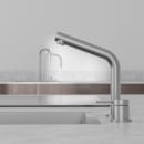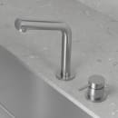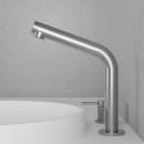 Det moderne og minimalistiske håndvaskarmatur Harmonized B2 fra Scandtap er fremstillet i børstet rustfrit stål, og består af en separat tud og greb, som er beregnet til bordmontering i 2 huller a Ø35 mm.