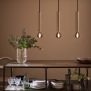 Sencillo pendel fra Markslöjd. pendel i messing med tre cylinderskærme. 50 cm høj. Med sorte tekstilkabler. Kabellængde 1,5m, 3xE27, Max 40W. Pærer medfølger ikke.