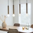 Sencillo pendel fra Markslöjd. pendel i messing med fire cylinderskærme. 50 cm høj. Med sorte tekstilkabler. Kabellængde 1,5m, 4xE27, Max 40W.